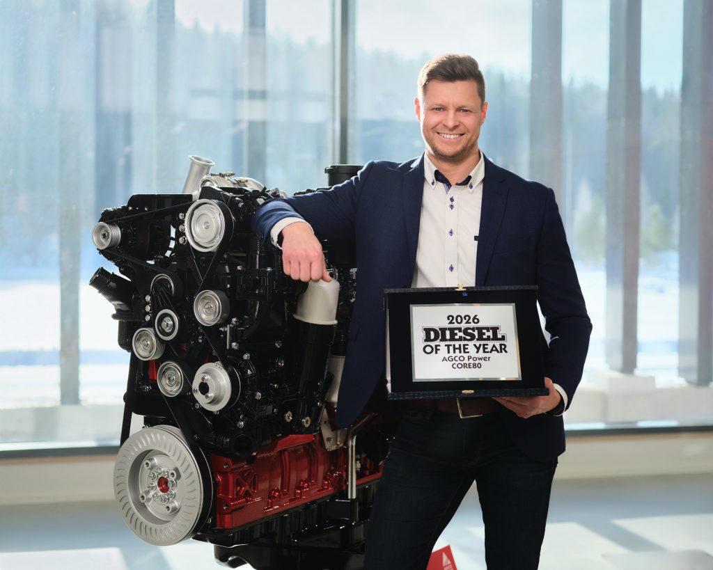 AGCO Powerin CORE‑moottoriperhe on ollut erittäin menestyksekäs. Vuonna 2023 Power Progress nimesi CORE75‑moottorin Vuoden moottoriksi, ja tänä vuonna Powertrain International valitsi CORE80‑moottorin Vuoden dieselmoottoriksi. Voittoisan CORE80-moottorin etualalla Juha-Pekka Asikainen.